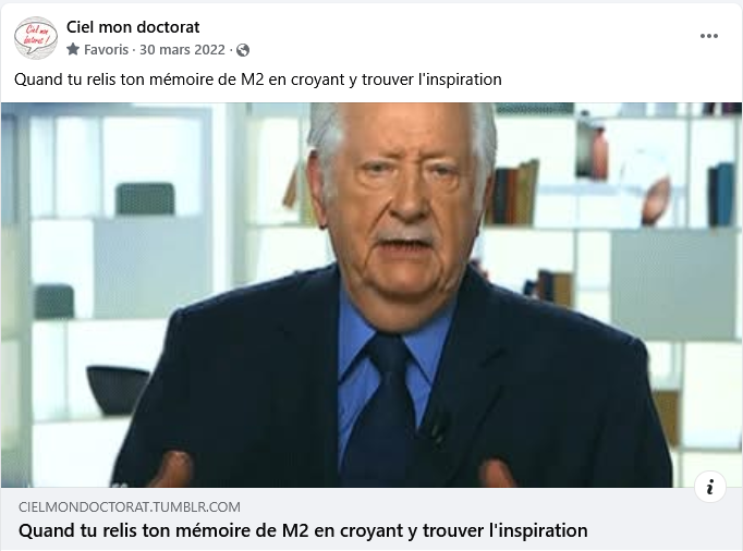 Publication sur la page Facebook de Ciel Mon Doctorat (qui renvoie sur le réseau social Tumblr)20