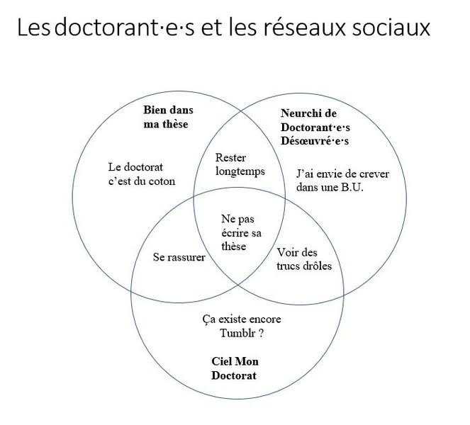 À la même époque, une page Instagram et un canal Discord s’organisent autour de « Bien dans ma thèse ». Le neurchi quant à lui se veut avoir une visée critique du doctorat et ne pas occulter toute la souffrance qu’il peut générer. Le mème ci-dessous construit autour d’un diagramme de Venn articule ces espaces virtuels autour du troisième cycle universitaire. Le Neurchi de Doctorant·e·s Désœuvré·e·s (NdDoc) pointe un profond désespoir, Bien dans ma thèse (BDMT) montre que le doctorat peut bien se dérouler et Ciel Mon Doctorat (CMD) utilise un réseau social (Tumblr) en perte de vitesse depuis quelques années. Les espaces convergent : entre NdDoc et BDMT où les doctorant·es passent un temps considérable, ils se rassurent sur BDMT et CMD et ils voient des « trucs drôles » (principalement des mèmes) sur NdDoc et CMD. Les trois espaces convergent (et c’est le tournant comique du mème) autour de « ne pas écrire sa thèse », en d’autres mots : procrastiner sur les réseaux sociaux.