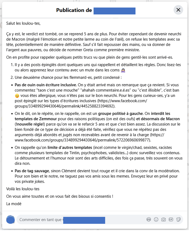 Au-delà de ce tournoi, un nombre assez important de personnes militant contre l’écriture inclusive intègrent le Neurchi de doctorant·e·s désœuvré·e·s (SHS) – NdDoc pour en insulter ses membres. Ils utilisent également des techniques de signalement (de publications et de commentaires) afin que l’algorithme Faceook supprime le groupe52. Ces derniers mènent donc un « raid » qui sera attribué à « l’extrême droite ». Rapidement, une équipe de modération s’organise pour rétablir le calme et éviter une fuite trop importante des doctorant·es. Elle affiche clairement son positionnement politique comme sur la publication ci-dessous :