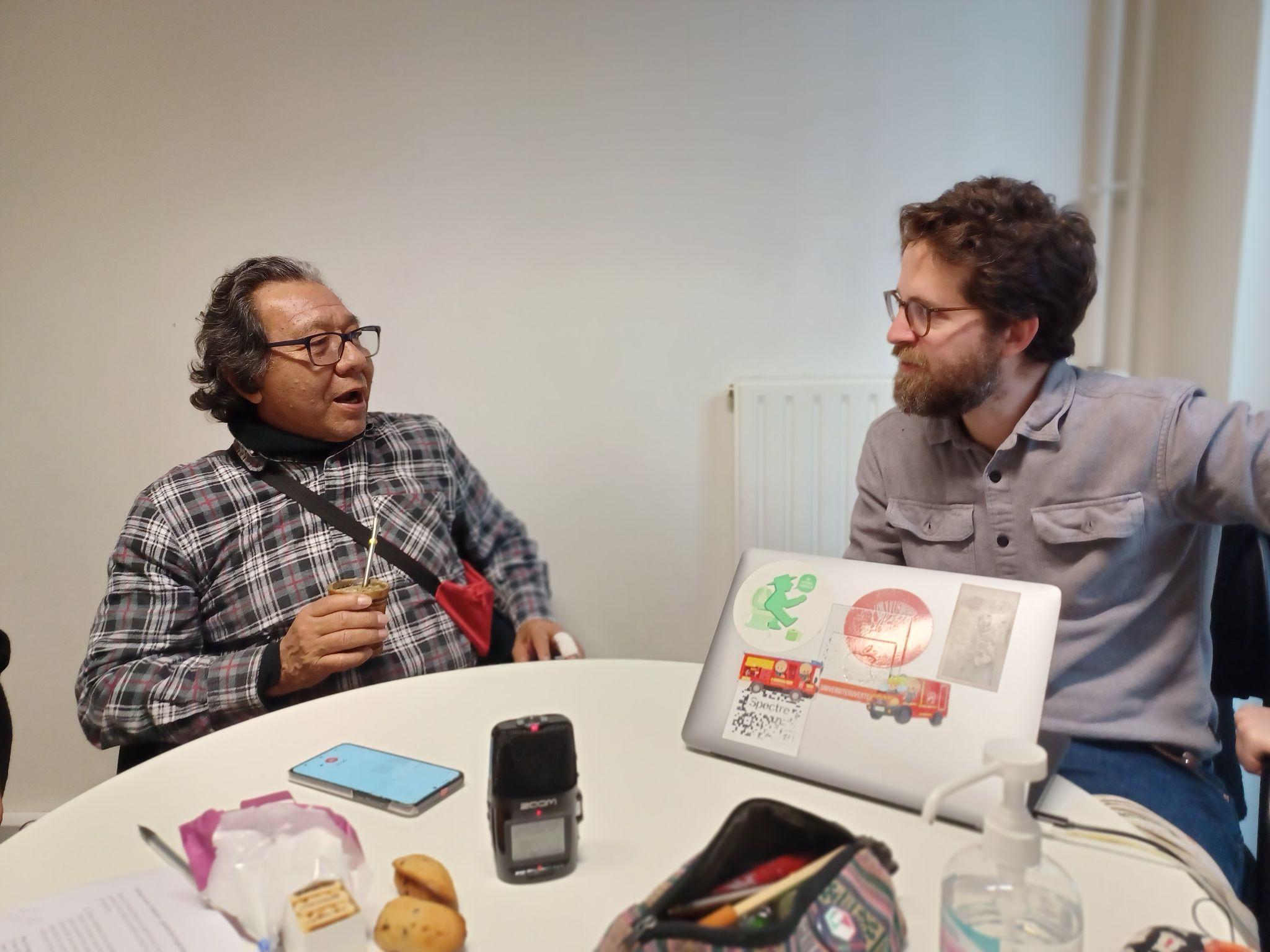Figure 1. La conversation en guarani du 20 février 2025 à l’INALCO. Anastácio a la calebasse à maté dans la main, Joaquín est près de lui.
