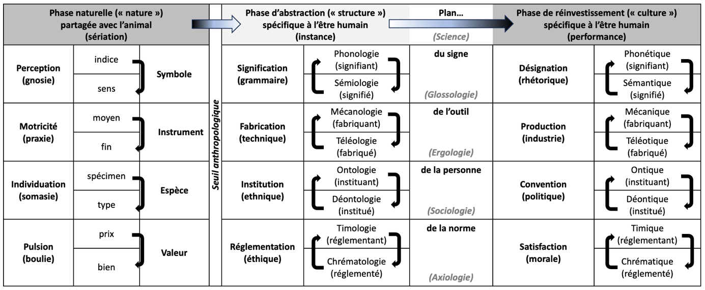 Pour percevoir la portée globale du modèle anthropologique de Jean Gagnepain, et comprendre la manière dont s’agence ce qui est exclu du fonctionnement rationnel de la technique, il convient de préciser que l’outil est formellement structuré de la même manière que les trois autres plans de rationalité : le signe, théorie glossologique articulant un signifiant et un signifié ; la personne, théorie sociologique articulant un instituant et un institué ; et la norme, au sens de règle que l’on s’impose à soi-même, articulant axiologiquement un réglementant et un réglementé.