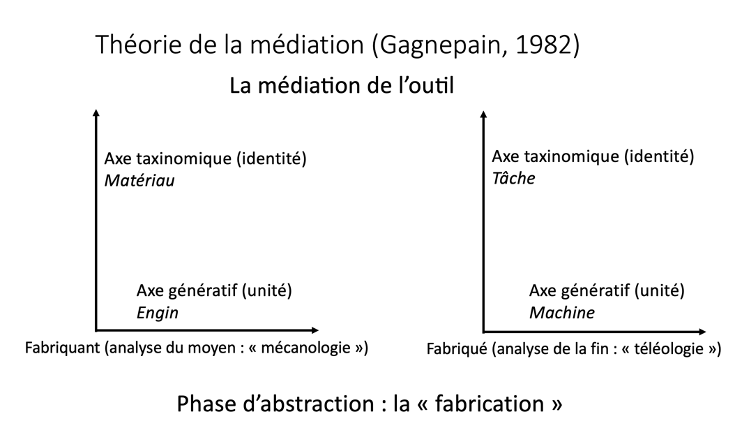 une phase d’abstraction (structure) spécifiquement humaine appelée fabrication : négation de l’efficacité immédiate du moyen et de la fin par l’analyse réciproque du fabricant et du fabriqué ;