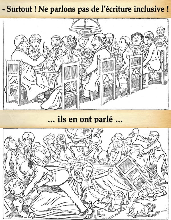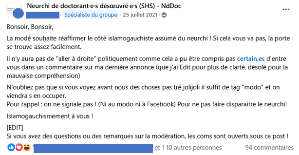 Au-delà de ce tournoi, un nombre assez important de personnes militant contre l’écriture inclusive intègrent le Neurchi de doctorant·e·s désœuvré·e·s (SHS) – NdDoc pour en insulter ses membres. Ils utilisent également des techniques de signalement (de publications et de commentaires) afin que l’algorithme Faceook supprime le groupe52. Ces derniers mènent donc un « raid » qui sera attribué à « l’extrême droite ». Rapidement, une équipe de modération s’organise pour rétablir le calme et éviter une fuite trop importante des doctorant·es. Elle affiche clairement son positionnement politique comme sur la publication ci-dessous :