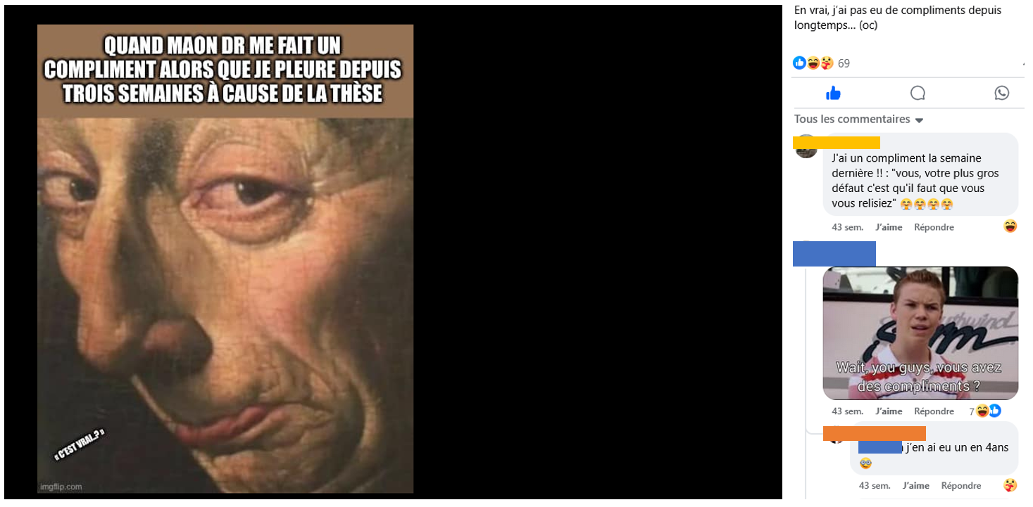 Le mème ci-dessous donne une idée des échanges dans le groupe. Une doctorante partage un mème qui montre son désespoir face au travail de sa thèse ainsi qu’un élément déclencheur « un compliment de son ou sa directeur·ice ». L’image détournée d’un tableau entraîne une discussion en commentaires27. La deuxième réponse, par un autre mème, montre l’interrogation de son autrice face au directeur·ice qui complimente le travail. L’autrice du premier mème lui répond que c’est le seul compliment en quatre ans.