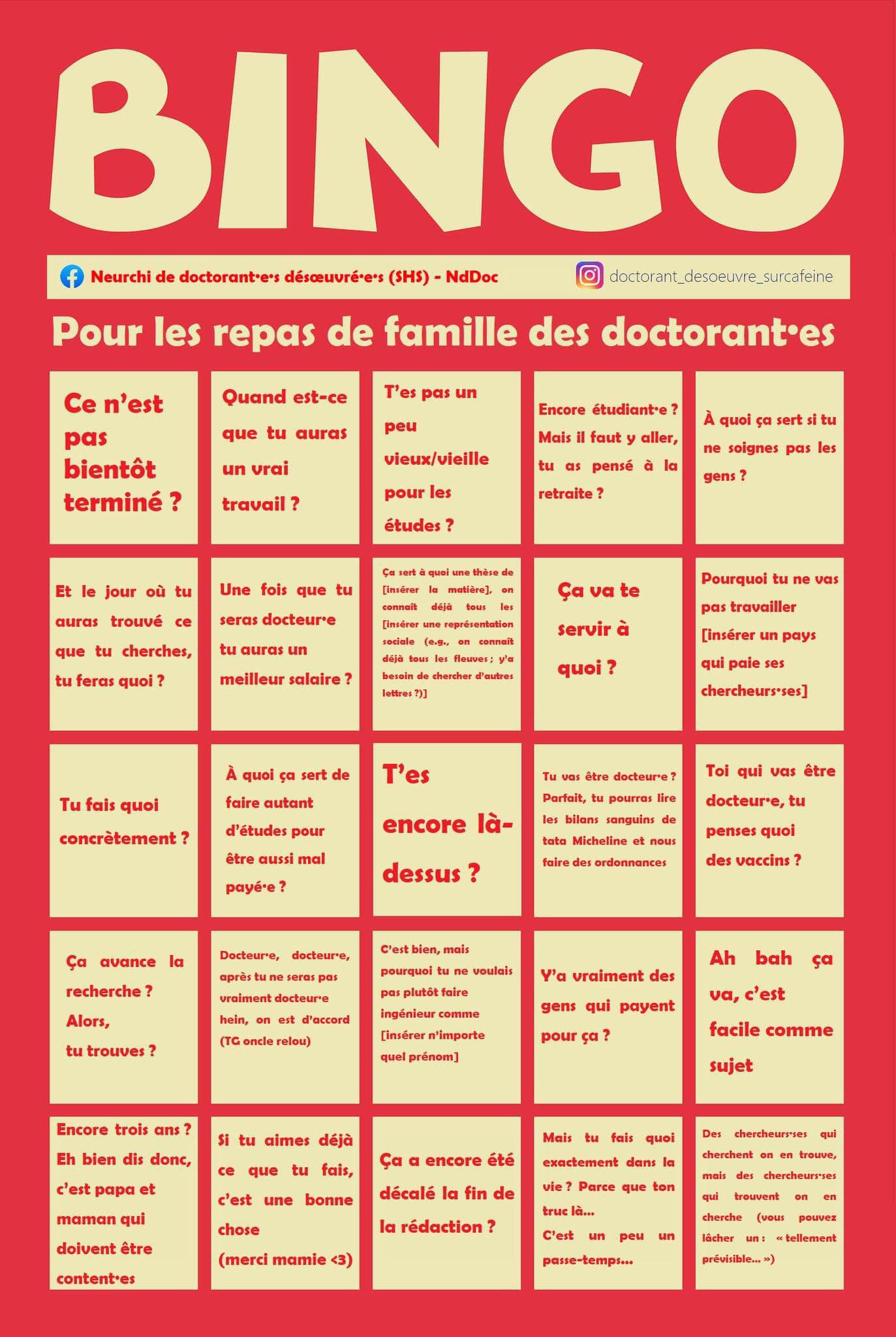 Un autre exemple, hors université cette fois, avec les repas de famille. Le mème reprend vingt-cinq réflexions auxquelles les doctorant·es se trouvent confronté·es régulièrement. Ce bingo vise quant à lui à conscientiser le rapport de l’entourage des jeunes chercheur·ses au doctorat. Il pointe également une méconnaissance du monde académique « tu fais quoi concrètement », « ça va te servir à quoi » (sous-entendu dans la vie), ainsi que les violences symboliques quotidiennes « docteur·e, docteur·e, après tu ne seras pas vraiment docteur·e hein, on est d’accord » (en référence à « docteur·e peut-être, mais pas médecin », le sous-entendu réside dans le « manque » d’utilité sociale et souligne ainsi le manque de reconnaissance).