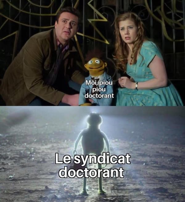 Néanmoins, ces cinq dernières années de vie du Neurchi de Doctorant·e·s Désœuvré·e·s (SHS) – NdDoc ont montré que des personnes précaires, avec peu de reconnaissance institutionnelle et plutôt isolées (ou confinées), pouvaient se rassembler et trouver collectivement des leviers de lutte contre leur aliénation du monde universitaire. La rétrospective de ce témoignage a amené le premier auteur à repasser un temps incalculable sur le neurchi et à, une fois encore, procrastiner en regardant des mèmes avec une douce nostalgie (bien différente du désœuvrement quotidien de son doctorat, qui lui a donné une force de production mémique considérable).