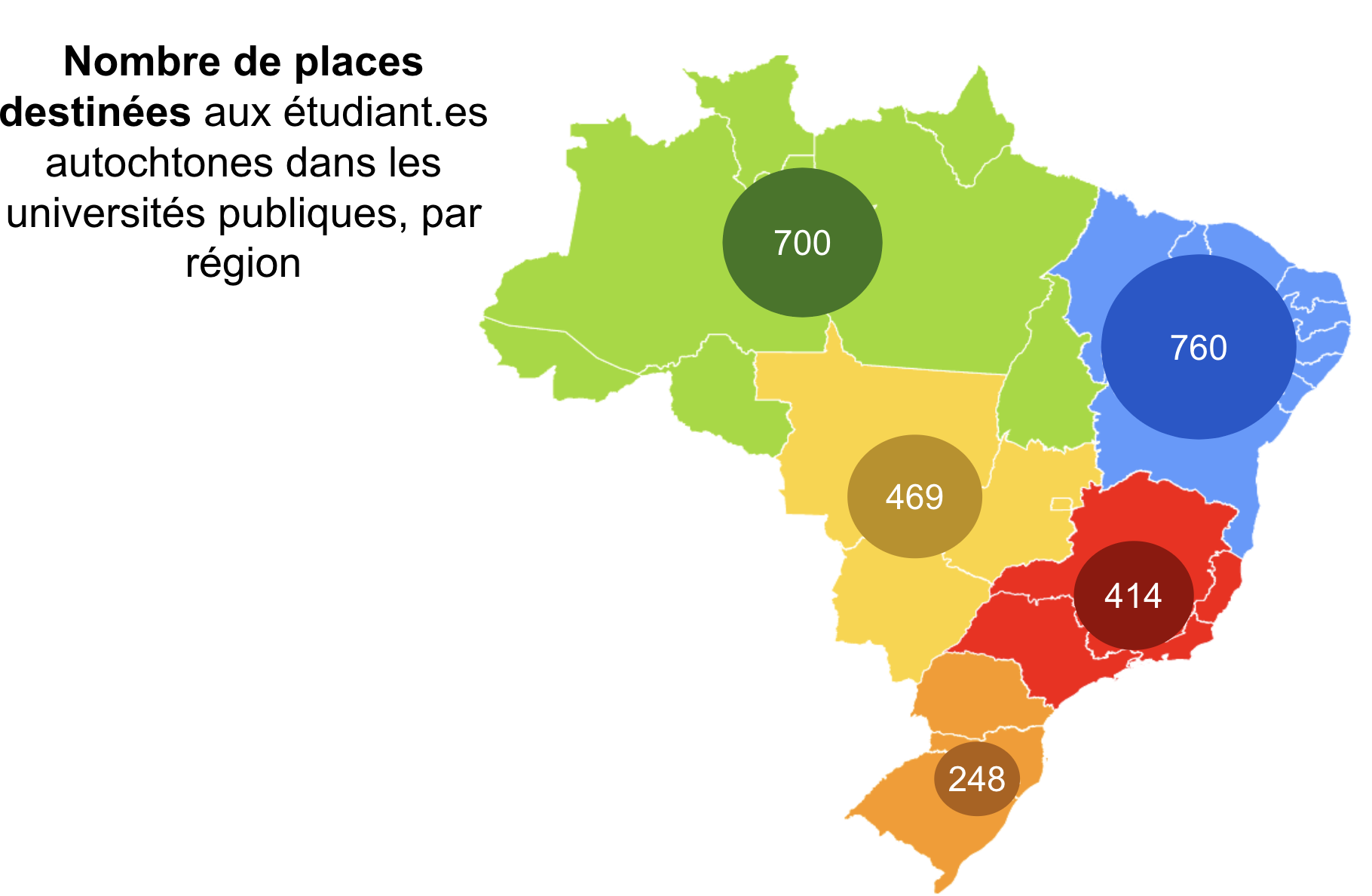 Sur les 110 universités publiques que compte le pays, 20 destinent des places aux étudiant·es autochtones dans le cadre de leurs concours d’entrée ordinaires, et 31 ont créé des vestibulares indígenas ou dispositifs équivalents, organisant un processus de sélection différencié. Ces données révèlent que près de la moitié des universités publiques brésiliennes (46 %) ont mis en œuvre une forme de discrimination positive à destination des étudiant·es autochtones, en vue de favoriser leur accès aux cursus de licence. Le premier vestibular indígena crée au Brésil est celui des universités de l’État du Paraná, en 2001. Depuis, des universités dans toutes les régions du Brésil ont suivi le pas.