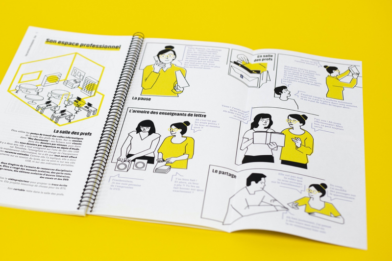 Des pages dépliables qui donneraient à voir une tranche de la vie quotidienne d’un·e enseignant·e, dans l’établissement ou dans son espace de travail personnel.